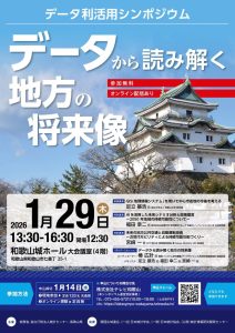 ーデータ利活用シンポジウムのご案内 ー 「データ利活用シンポジウム~データから読み解く地方の将来像~」が2026年1月29日(木)に和歌山城ホールで開催されます。 ■申込締切 1月14日(水) ■参加方法 現地参加(定員120名/先着順)のほか、オンラインでの視聴も可能です。 【内容及び事前申込みURLは、こちらからどうぞ】 【参考:総務省の報道資料】